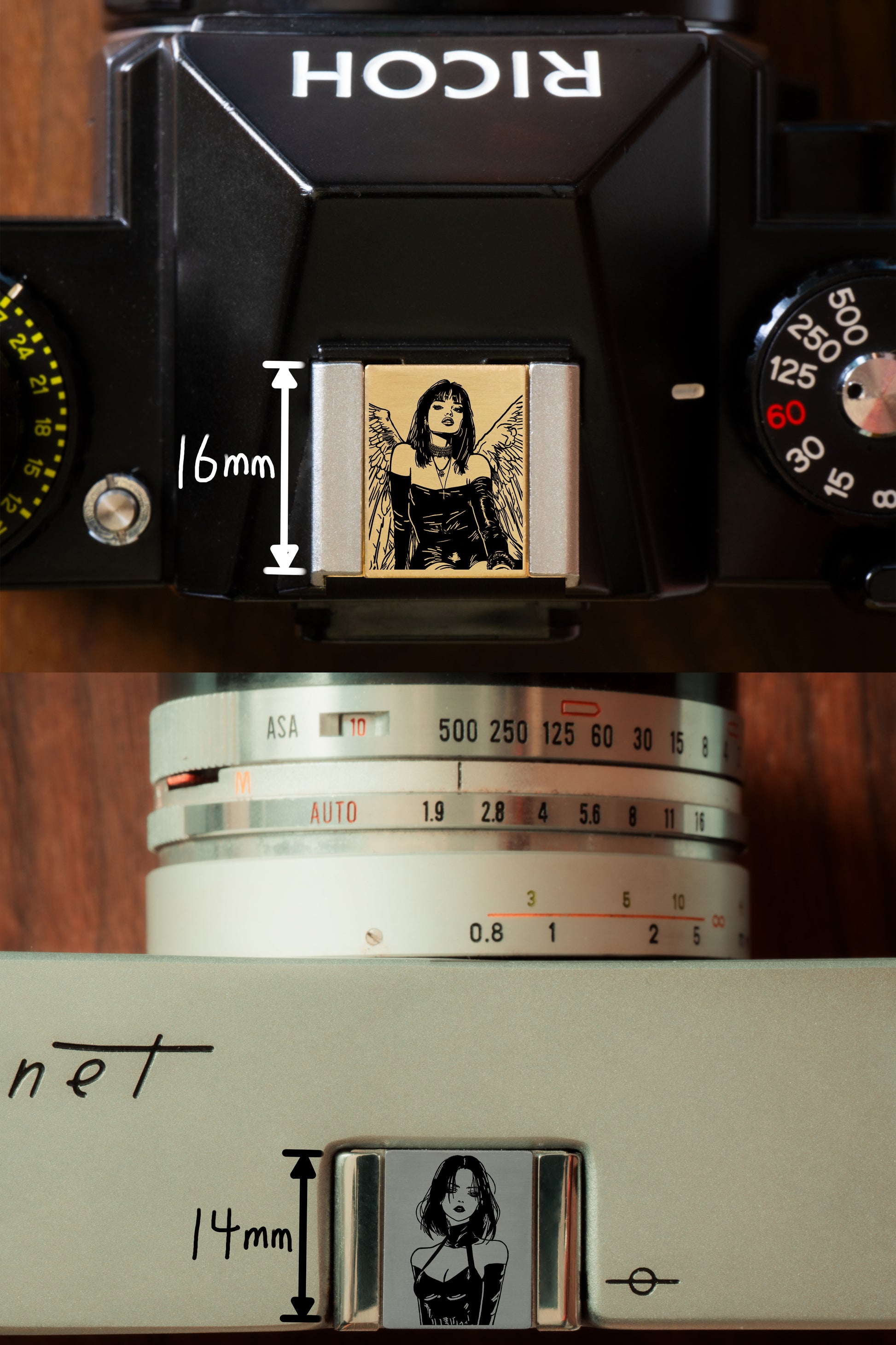 手描きの原画をもとに、金属製のホットシューカバーに繊細なレーザー彫刻を施しています。